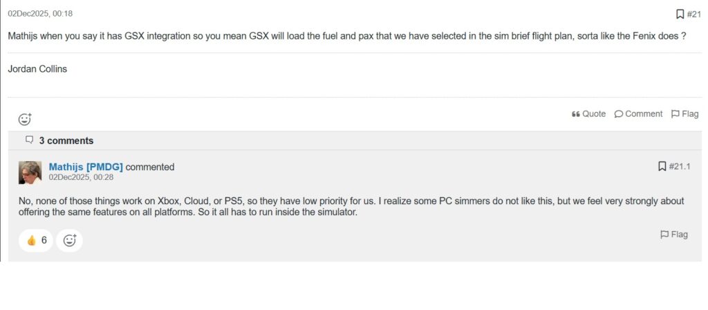 The fact that PMDG has made the decision to drop GSX Integration from their products simply because it’s not available to console users is shocking. After all, it’s been us PC simmers who have helped PMDG enjoy the success over the past 25+ years. While I realize the console market may be an important revenue stream for PMDG, I don’t understand why both streams can’t be managed independently of each other. Especially considering that PMDG continues to distribute to PC customers via OC3.